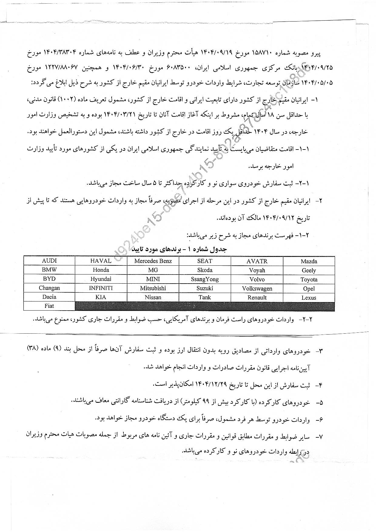 1.2- فهرست ویژندهای مورد تأیید خودروها به شرح مندرج در جدول شماره ( 1 ) نامه شماره: 6820677 مورخ : 29 / 09 / 1404 وزارت صنعت ، معدن و تجارت ( پیوست ) میباشد ؛